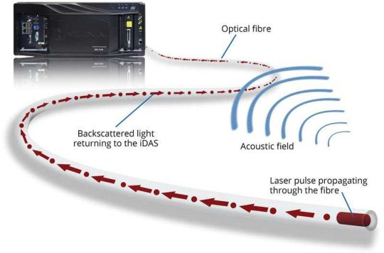 iDAS technology measures the acoustic signal at all points along many kilometres of the optical fibre as if it were a string of microphones.